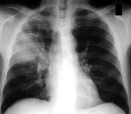 A 35‐year‐old refugee from Eritrea had a 4‐month history of night sweats and weight loss. Recently he had become more short of breath and had haemoptysis. He shared a room with four other family members. He has lived in the UK for 6 months. Though he remained haemodynamically stable he had a temperature of 38°C. Bronchial breathing was heard in the right upper zone of his chest. He had a mantoux test which was read 48 hours later and found to be strongly positive. He had a chest X‐ray (Fig. 0007) and his sputum showed acid‐fast bacilli.