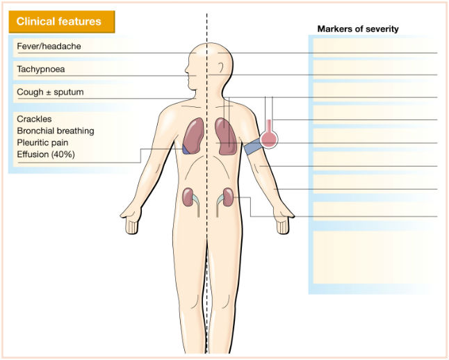 Flashcard 54: Lower respiratory tract infection: Markers of severity of pneumonia (Fig. 107) Fill in the missing labels. For more details, read the corresponding chapter in Medicine at a Glance, 4th Edition. « Previous Next » Show Labels « Back to contents list Print